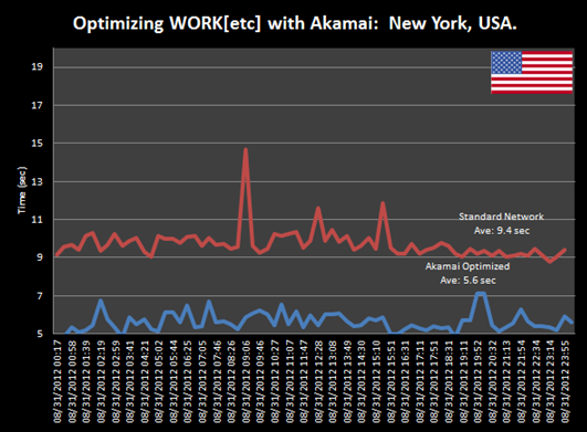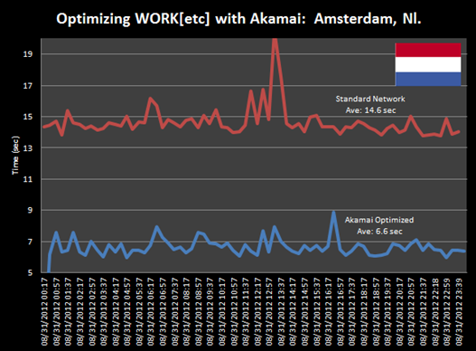 So obviously we have a huge speed improvement to benefit from here. But performance is only half of the picture. The Akamai product also intelligently routes traffic around network traffic jams and other issues; kind of like a GPS for your WORK[etc] network traffic.