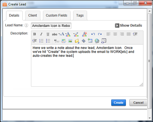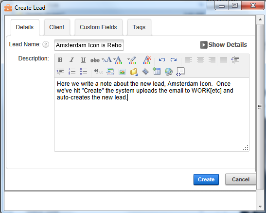 The last part of this release is the ability to create a new WORK[etc] activity on-the-fly and attach that email to the new activity. In the example below we're creating a new sales lead from an email. As you can see, all the basic and advance lead options are available in the dialog box, just the same as if you were doing this inside of WORK[etc]: