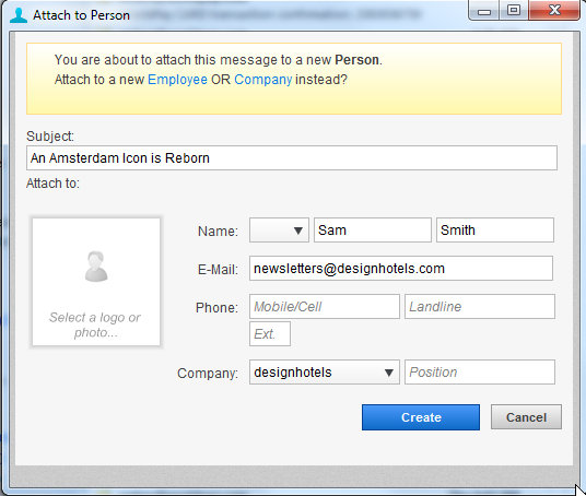 - Click any email from Outlook and attach to a contact (company, person or employee)