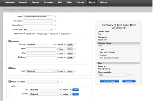 After making the two new fields and adding them to your tasks you are now ready to make the Saved Views. Go to Reports -> Saved views and Create a new saved view. First make the Saved view GTD Stuff Inbox list, then the GTD Tasks Next Action list. This saved view contains all the tasks with the List equal to Next Action and no Context.