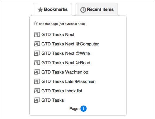 In the screen below you see an overview of my saved views. For each list I have made a saved view in WORK[etc] and ad dit as a bookmark. The beauty of WORK[etc] is that I now can access all my lists and contexts all the time. If I am at my computer and I want to do some tasks behind the computer, I just press the GTD Tasks Next @ Computer and I see things I can do behind the computer. If I have some time and want to read stuff, I press the GTD Task Next @Read and see my reading list.
