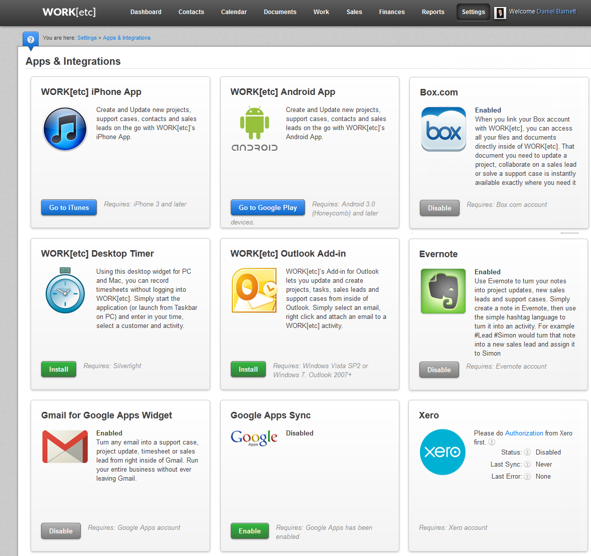 All of the WORK[etc] apps and integrations can now be accessed from the single Settings Menu. Also note that the Outlook Add-in is now out of beta and readily available.