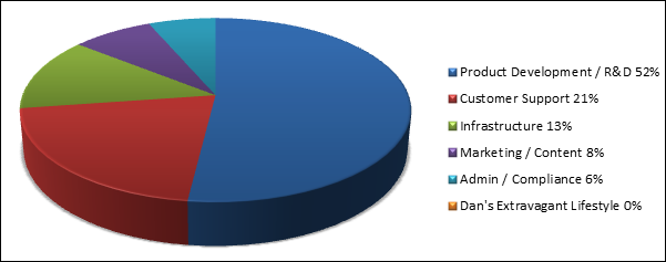 Then another 20% on customer support and another 12% on servers, bandwidth and back up.  Essentially everything gets reinvested into the business.  A fee increase means collecting more money to fund product development faster and build out real time, live customer support options.