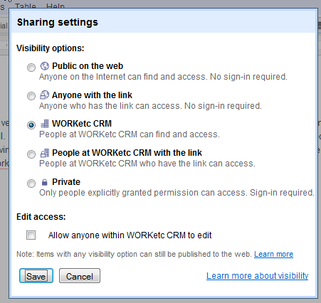 Note: When using Google Docs inside of WORKetc, WORKetc will always respect the permission settings you have set inside of Google Docs. So, if it looks like a Google Docs file is not showing up inside of WORKetc, remember to check permissions first: