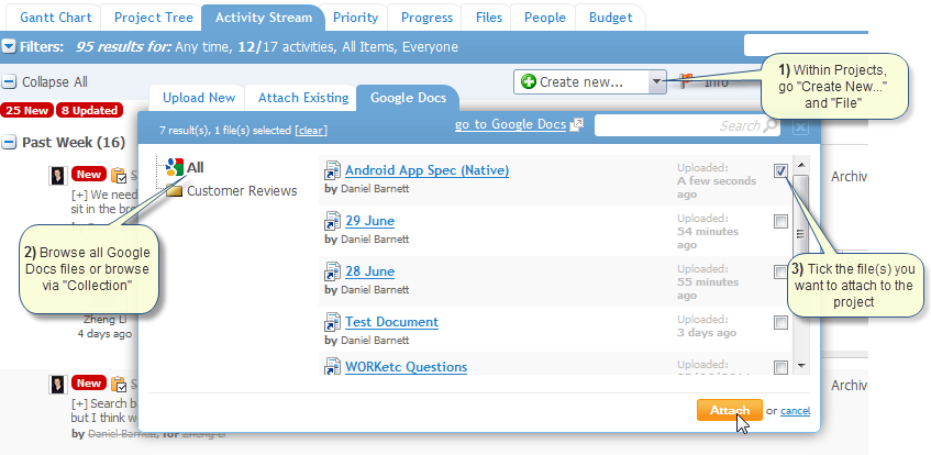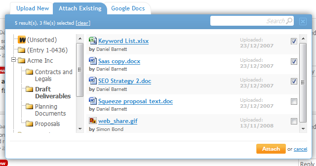 The WORKetc project management tool is likely the main place in WORKetc where most people will be looking to attach Google Docs files. Again, really straightforward: