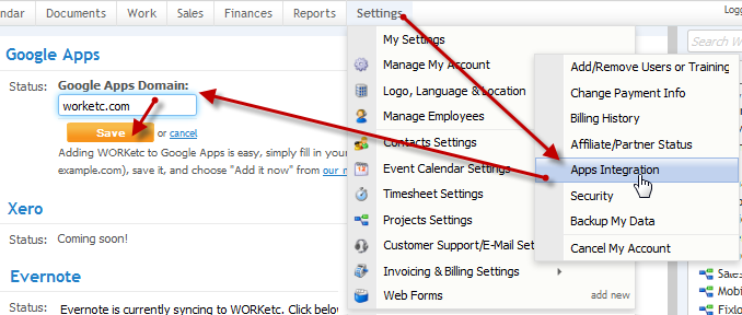 Google Apps Domain set up, then inside of WORKetc simply enter the domain in at Settings -> Manage My Account -> Apps Integration